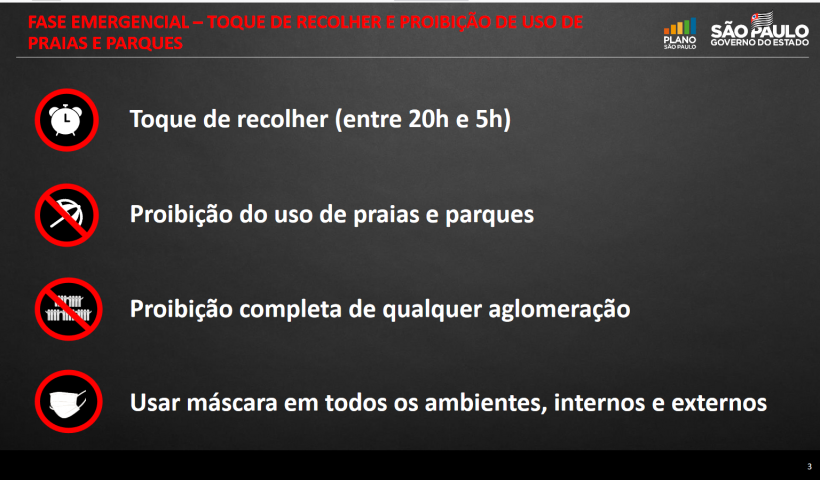 Veja mais Brasil tem fim de semana mais letal da pandemia: 5 mil mortos e 130 mil novos casosGoverno de São Paulo prorroga fase emergencial de combate à pandemia até 11 de abril